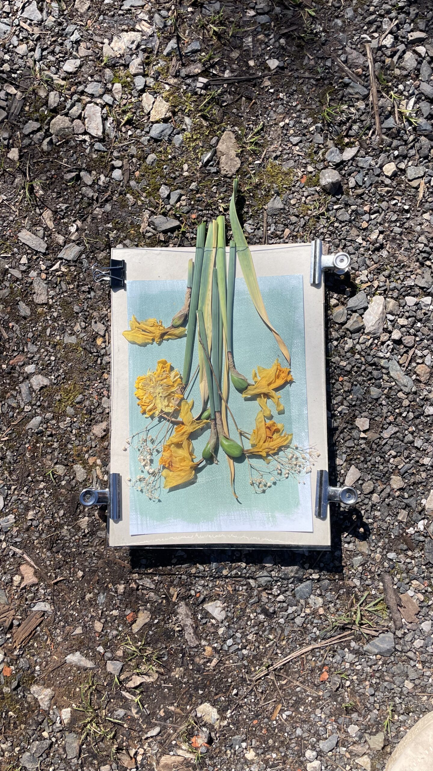 Je l’explore à travers différentes techniques — fleurs pressées, empreintes végétales, cyanotype, papier fleuri — autant de façons de capter une trace, une forme, une lumière.