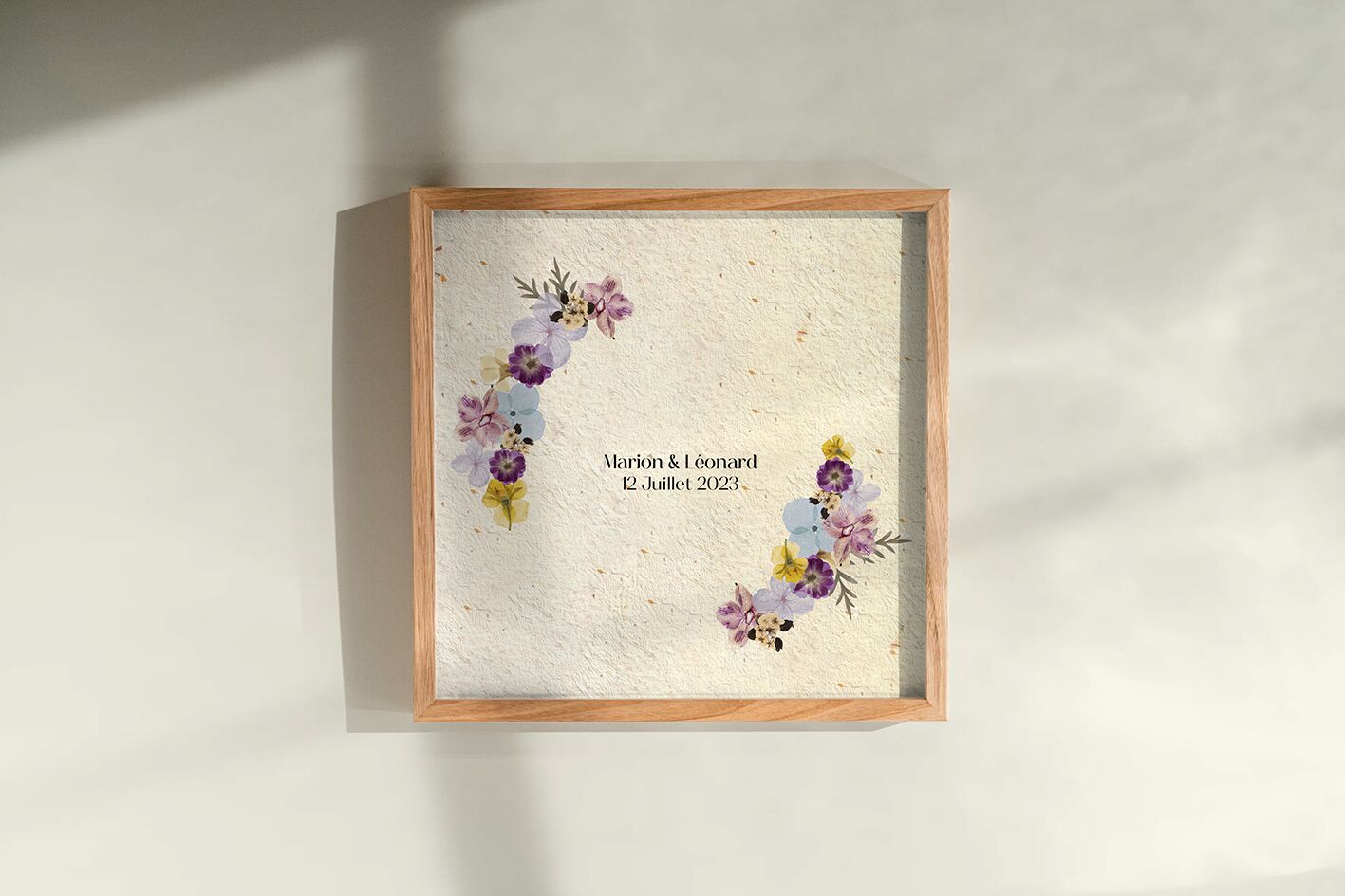 Illustration végétale artisanale, réalisée à la main avec soin et composée de véritables fleurs pressées 100% naturelles.