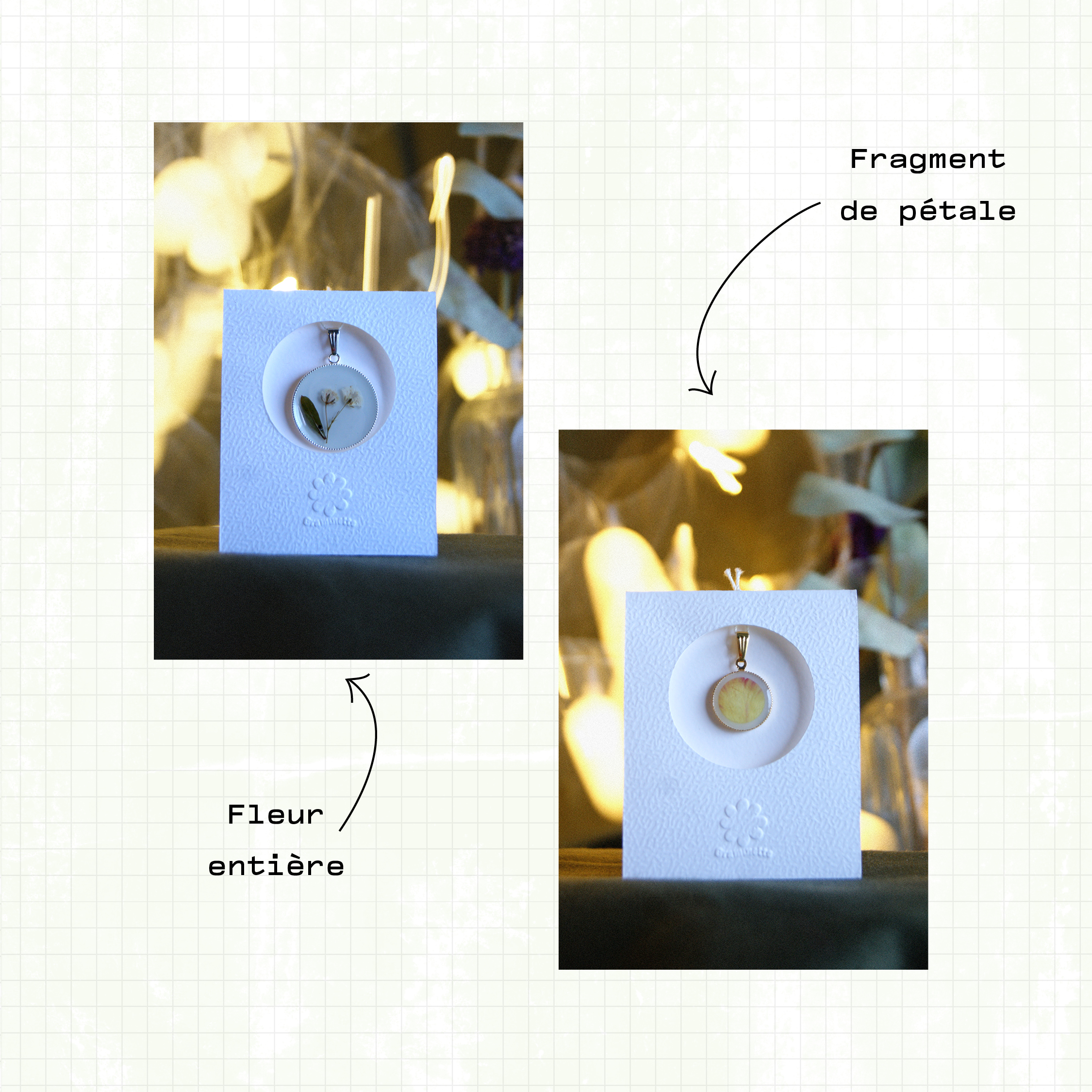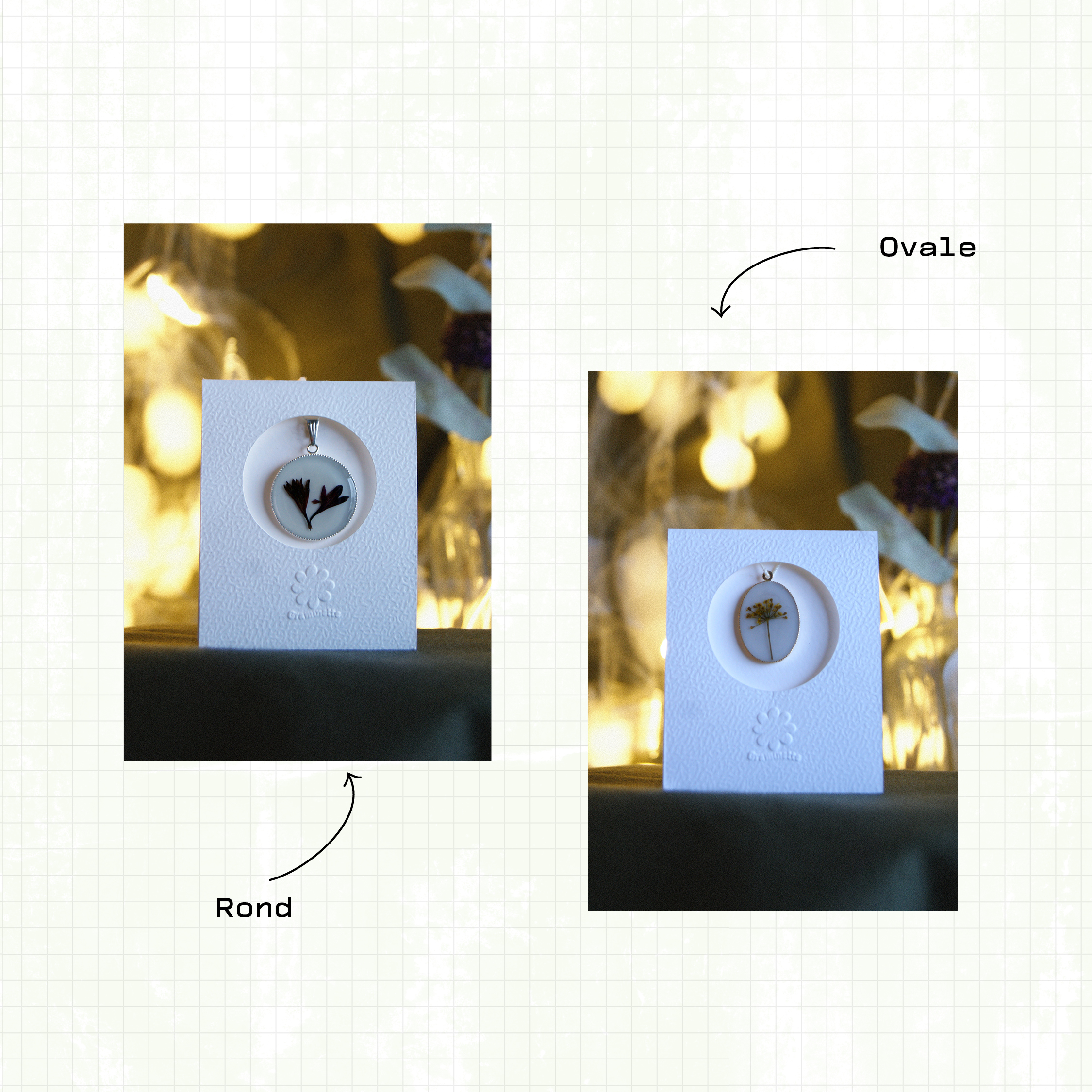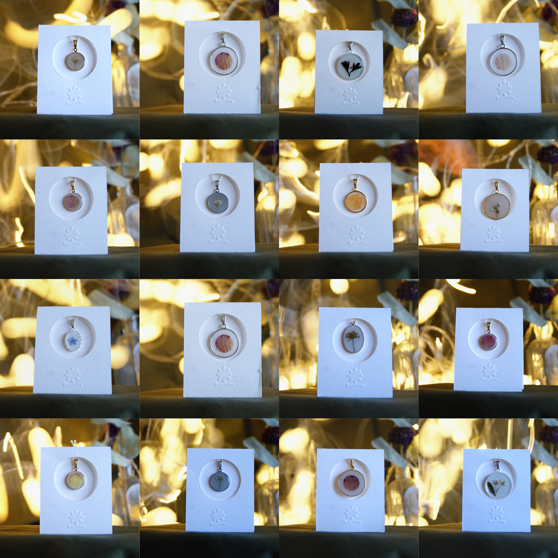 Créez un médaillon unique, délicatement orné de véritables fleurs pressées naturelles, récoltées et pressées localement à l’atelier puis coulées dans la résine.