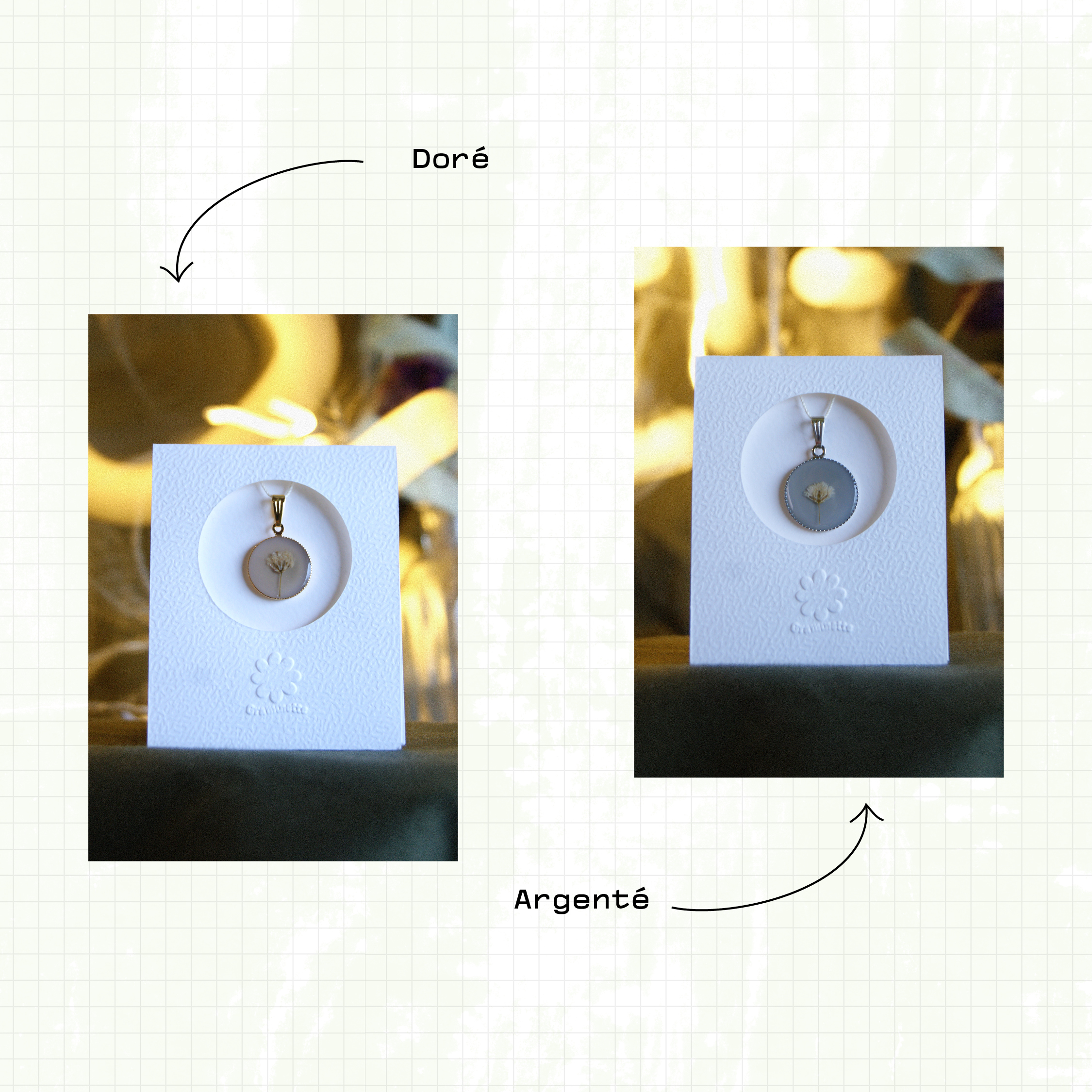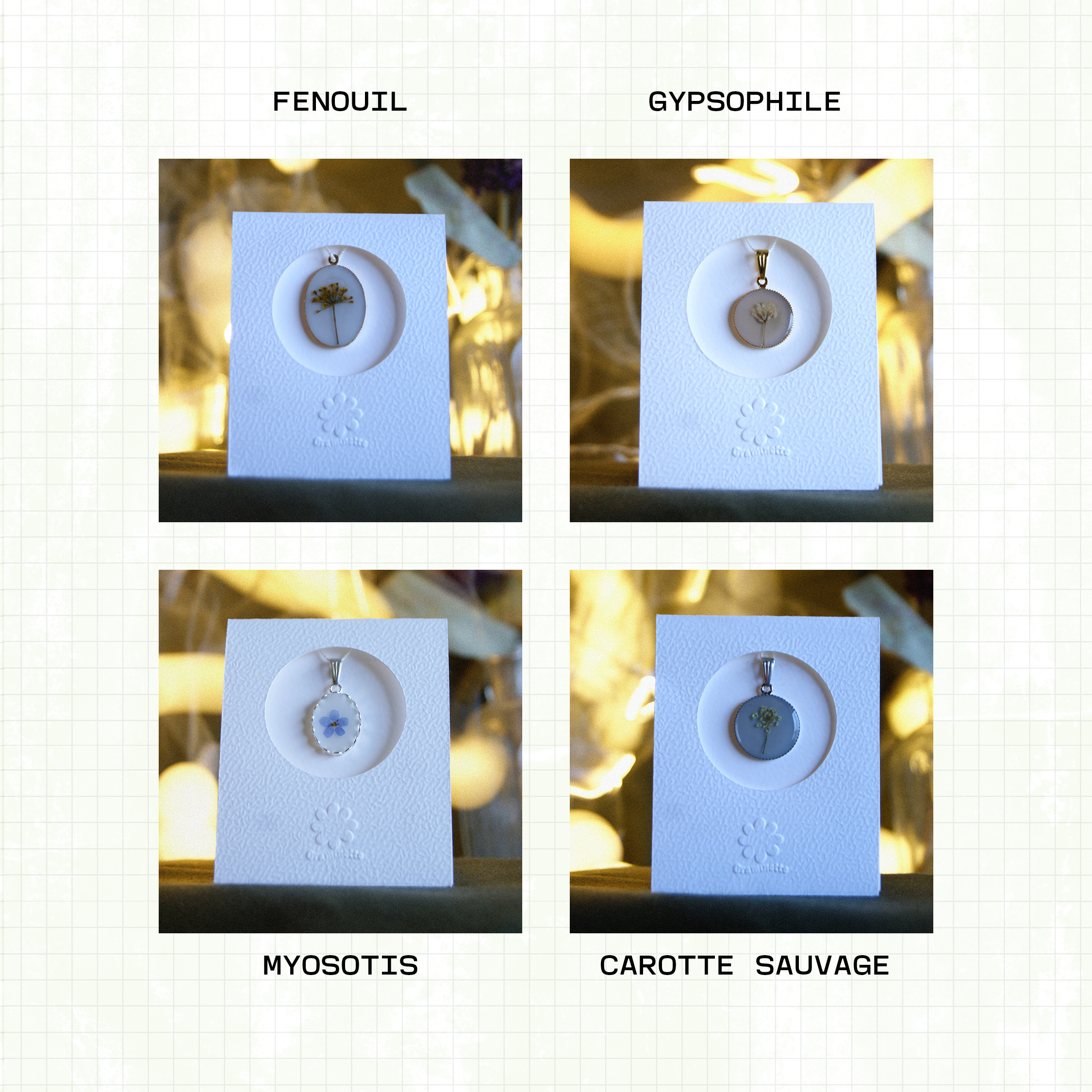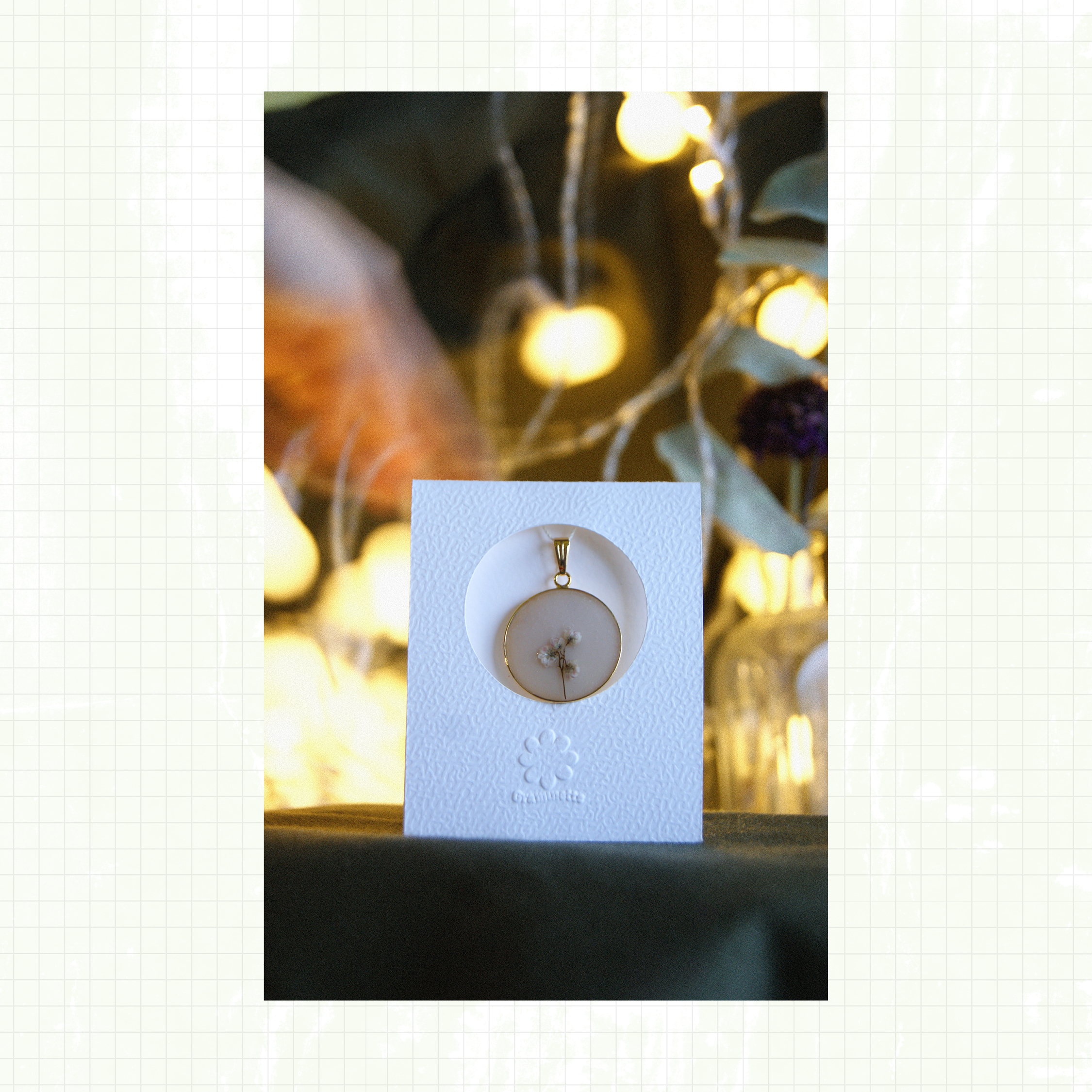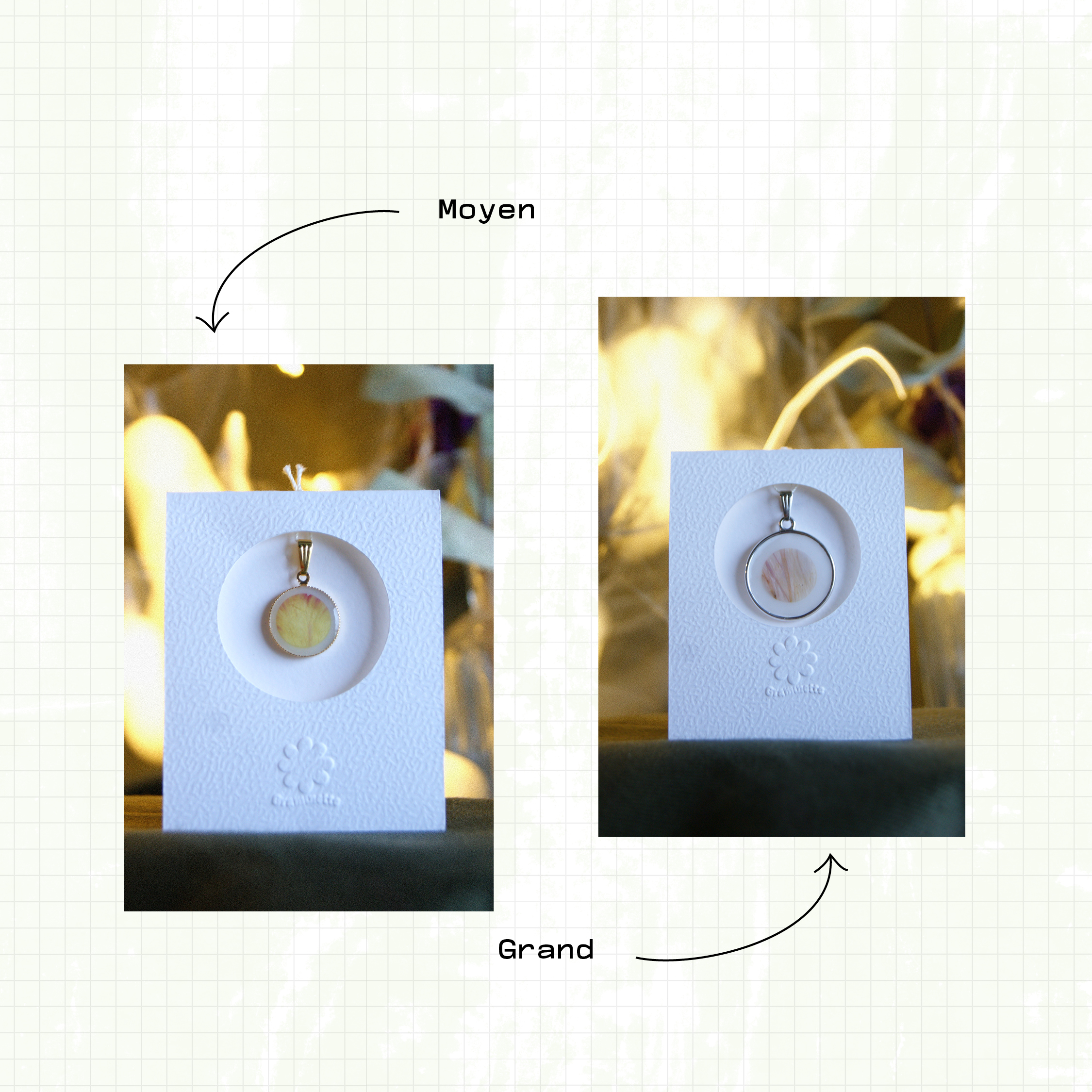 Créez un médaillon unique, délicatement orné de véritables fleurs pressées naturelles, récoltées et pressées localement à l’atelier puis coulées dans la résine.